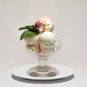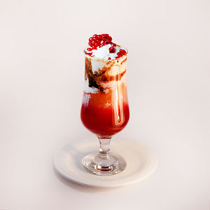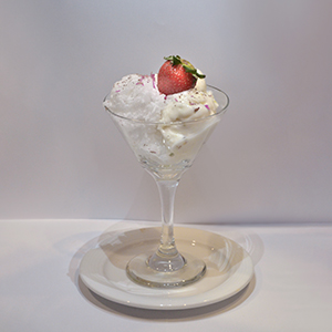 انبه،توت فرنگی،بستنی وانیلی،خامه،سس شکلات