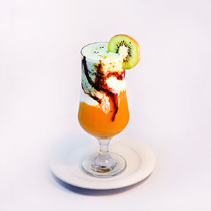کیوی،انبه،بستنی وانیلی،خامه،سس شکلات